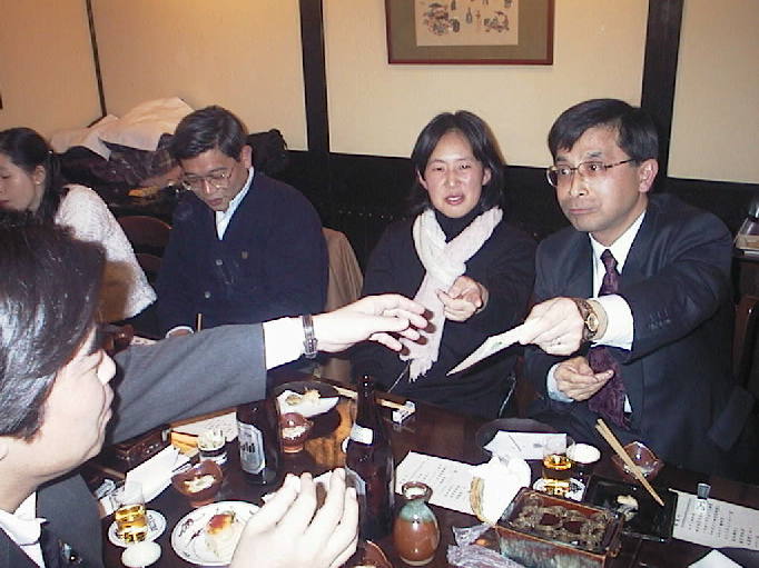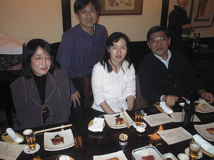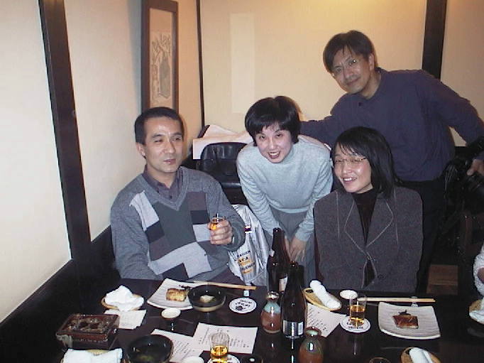 中前氏、松岡(旧姓:森田)さん幹事両名の呼びかけで20名も集まり、男女の割合もほぼ 10名づつという楽しいメンバーにめぐまれ午後1:30に始まった宴会もあっという間におひらきの 時間を迎えました。この時は16:00を少し回った頃で銀座の歩行者天国をブラブラとみんなで 歩きながら次の止まり木を求めてさまよいました。我々のハイテンションは2次回のカラオケ でも大爆発し、お昼から夜更けまで楽しいひと時を過ごしました。